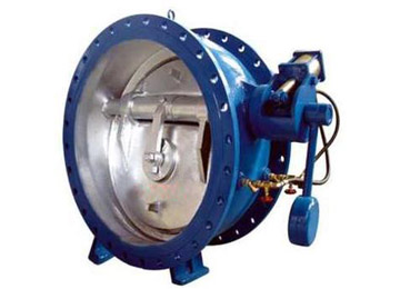 2、 停泵關閥時,閥門進口壓力低于或等于閥門出口壓力時,此時閥門的大蝶板在壓力差及重力作用下迅速關閉,截斷絕大部回水,同時,平衡錘通過閥桿帶動小蝶板緩慢關閉,泄除部份回流水,閥門進入緩閉階段。經節流閥實現閥門第二階段關閉(慢